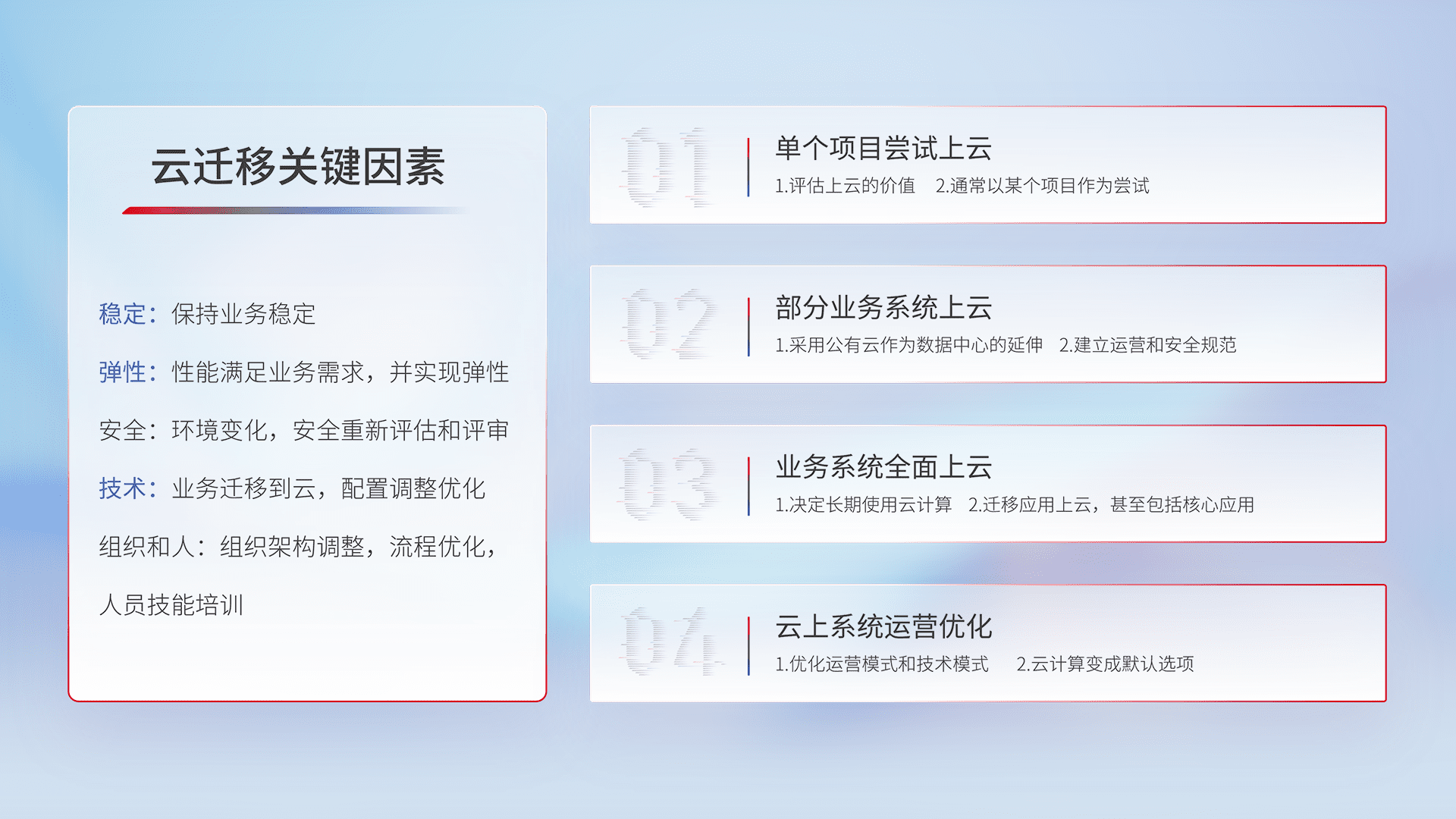 结合实际业务,,,从规划设计、、、云平台选型、、、、云原生改造、、、数据迁移、、、、集成交付,,迁移全过程为客户识别最佳上云路径,,做好风险识别管理,,,设计网络架构、、身份权限、、、、安全审计合规、、、、操作审计、、日志审计、、、、监控告警策略、、、多站点容灾设计等,,,对云上基础设施进行整体规划,,,提升IT治理水平,,,以满足弹性、、、、高可用、、高性能的需求。。。。